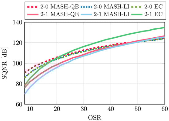 for the 2-1 MASH-QE. Both architectures give similar SQNR values. Figure 4 shows the simulated SQNR. All architectures can achieve the same SQNR as intended. Furthermore, it can be observed that the MASH-LI and the 2-0 EC have slightly lower SQNR values than the MASH-QE. The reason can be found in the delayed passing of the quantization error of the first to the second stage and is also reflected in the SQNR equation for the MASH-LI: