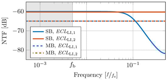 This version of error cancellation logic is referred to as ECLLI,2. From this, we can explain why in the multi-bit case, 2-0 MASH-LI behaved identically to 2-0 EC, but not in the single-bit case. One can derive that using ECLLI,2, this makes a 2-0 MASH-LI mathematically identical to 2-0 EC. In the multi-bit case, due to the used scaling coefficients shown in Table 1, , which makes the two versions of the digital filters identical, ECLLI,1 = ECLLI,2. Thus, 2-0 MASH-LI and 2-0 EC are identical architectures in the multi-bit case, but not in the single-bit case. Consequently, in order to explain the worse performance of the 2-0 EC compared to the 2-0 MASH-LI in the single-bit case, we look at the differences between the MASH-LI using ECLLI,1 or ECLLI,2. For this, it is helpful to have a look at their overall noise transfer functions (NTFs) [], which are shown in Figure 11. The solid lines use a single-bit quantizer in the first stage and OSR = 100. The dashed lines use a three-bit quantizer in the first stage and OSR = 60. The second stage is an eight-bit quantizer for the two cases. Depending on loop-filter scaling, a significant difference can be seen in the higher-frequency range. While for the multi-bit scaling with OBG = 4, no difference between the NTFs is visible (cf. dashed lines in Figure 11), a less aggressive scaling yields a significantly higher quantization noise suppression in case of the ECLLI,1 (solid blue).