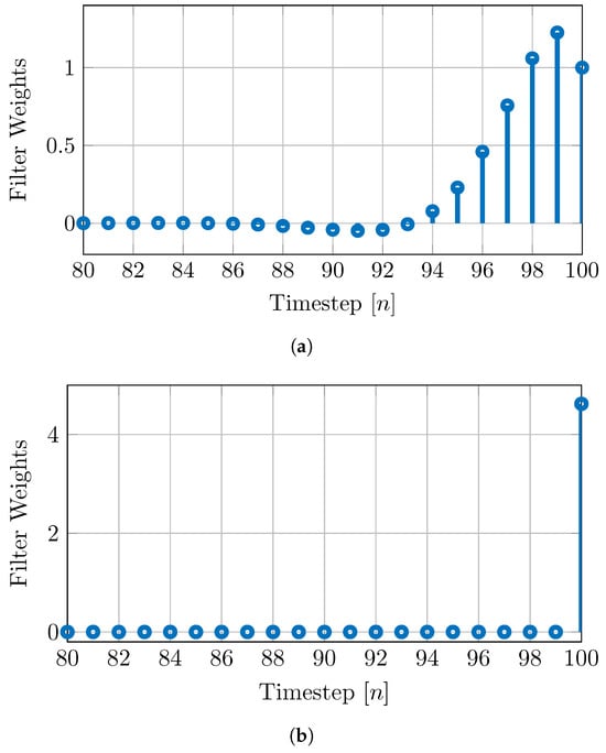 Digital filter weights of the output of the second stage () in the case of the 2-0 MASH-LI at an OSR of 100. The first stage is scaled with the single-bit coefficients of Table 1. (a) shows the weights when is designed after ECLLI,1 and (b) for ECLLI,2.