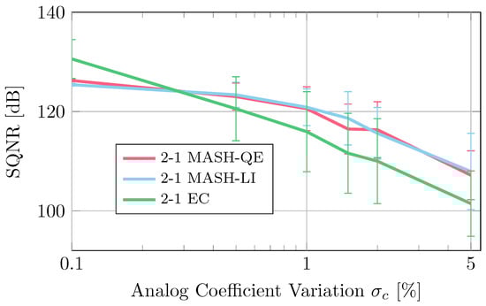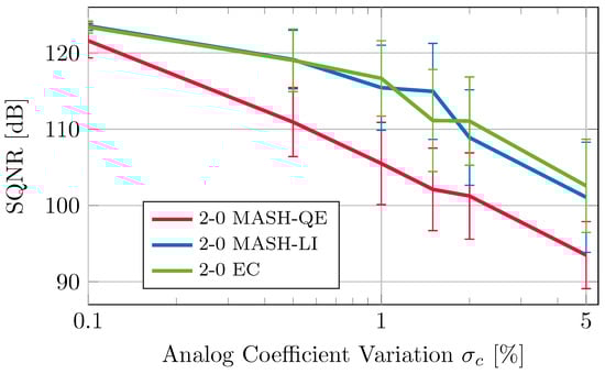 Figure 13 shows the simulated SQNR for the 2-0 architectures using OSR = 60, a three-bit quantizer in the first stage, and an eight-bit quantizer in the second stage. The inter-stage gain is set to 6. The simulations shown represent the average of 25 Monte Carlo runs of a Gaussian distribution around the nominal MB analog loop-filter scaling with a standard deviation of as a percentage at an input amplitude of −6 dBFS sinusoidal signal. Additionally, the error bars depict the standard deviation of the resulting SQNR values. The 2-0 MASH-QE is the most sensitive, while the 2-0 MASH-LI (and the 2-0 EC, which is mathematically identical to the 2-0 LI) are more robust.