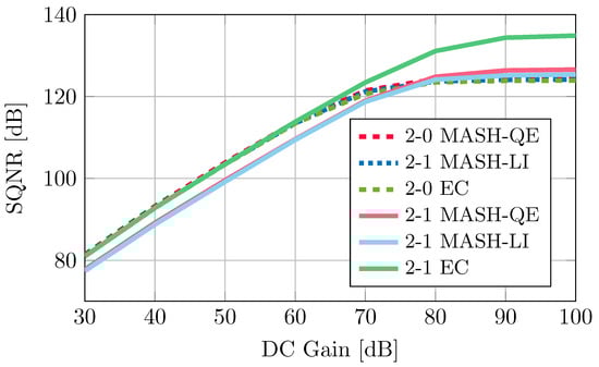 It is well known [,] that the finite integrator DC gain is a dominant source of noise leakage in MASH DSM, causing the analog transfer function to deviate from its ideal value and produce a mismatch between analog and digital filters. Accordingly, the SQNR of all considered architectures is finally simulated with respect to the finite integrator DC gain. The results are shown in Figure 15 at an OSR of 60, an inter-stage gain of 6, and at an input amplitude of −6 dBFS sinusoidal signal. The first stage uses a three-bit quantizer and the second stage uses an eight-bit quantizer in the case of (2-0) and a four-bit quantizer in the case of (2-1). As expected, all the architectures degrade at low DC gain. While the 2-0 MASH architectures operate with second-order noise shaping and increase their resolution by higher quantizer resolution in the second stage, their performance drop against finite DC gain is lower compared to the 2-1 MASH architectures, which aim to achieve ideal higher-order noise-shaping and are thus more affected by finite integrator DC gain. Interestingly, the 2-1 EC architecture performs similarly to the 2-0 MASH ones at a low integrator DC gain. This can also be explained by the fact that it is only a second-order I-DSM, while its second stage is an independent (Nyquist-rate) ADC, either achieving its resolution by higher quantizer resolution or by a first-order noise shaping. Therefore, facing finite DC gain, it behaves more like a 2-0 MASH than a 2-1 MASH.