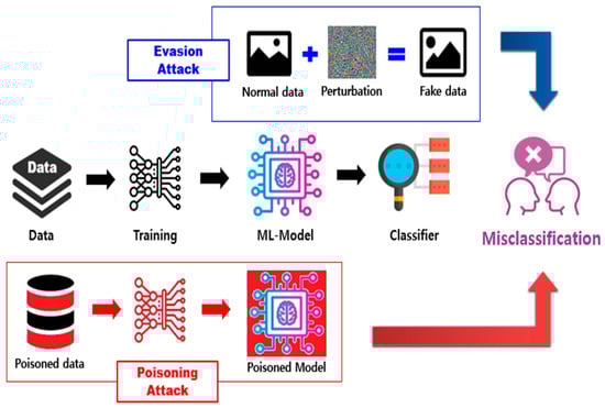 First, based on the attack timing, adversarial attacks can be divided into decision-time attacks on algorithms and training-time attacks on models (see Figure 1) [38,39,40]. Specifically, decision-time attacks (also known as evasion attacks) are performed after the model has been trained. These attacks intentionally manipulate input samples by adding perturbation to induce misclassification by the model. Altered inputs are known as adversarial examples. On the other hand, training-time attacks involve deliberately manipulating the training data before the model is trained. These attacks are referred to as poisoning attacks.