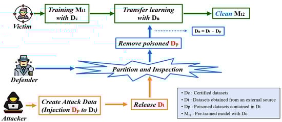 • Step 3 (clean dataset generation): After completing step 2, all non-removed sub-datasets are concatenated to form the dataset Du. As a result, Du is used for transfer learning to create a model Mt2. The transfer-learned model Mt2 is more resilient to the effects of poisoned data, thereby preventing performance degradation caused by poisoning attacks and maintaining stability.