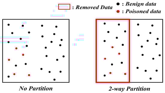 Next, partition and removal approach-based methods focus on improving the model accuracy by dividing a dataset into sub-datasets, using them separately for model training, and removing abnormal sub-datasets that significantly degrade the model accuracy [29,30,31,32,33,34]. As a representative method in this approach, RONI [29] evaluates the impact of each subset on the model’s performance to detect and remove poisoned data. Specifically, this method divides the dataset into several subsets, compares the model’s performance with and without each subset, and removes subsets that significantly degrade the model performance. In addition, P. P. Chan et al. [30] proposed an improved data sanitization method based on a metric called data complexity that distinguishes between poisoned data and clean data. However, this approach focuses on the model accuracy and thus misses the chance of detecting and capturing poisoned data, and it also requires repeated training and evaluation for each sub-dataset, which leads to high computation complexity.