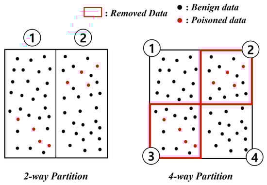 Next, we discuss the necessity of using various partitioning approaches. Consider the dataset Dt as shown in Figure 4. In this case, when we use the detection threshold of 20%, the 2-way partition and inspection fails to remove poisoned data because the poison rates (=13%) in both regions are lower than the threshold. However, when we apply the 4-way partition and inspection method, the dataset is divided into four partitions (region 1, 2, 3, and 4). As a result, the poison rates of region 2 and region 3 will grow to 26.7%. Therefore, the poisoned regions 2 and 3 will be detected and eliminated. This example clearly demonstrates that if the distribution of poisoned data are unknown, using multiple partitioning strategies can effectively improve the possibility of capturing and removing poisoned date samples from the dataset.