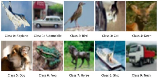 Figure 9. Example images from each class in the CIFAR-10 dataset. - Poisoning attack methods: With a poison rate of 20%, we poisoned 2000 out of 10,000 samples in the dataset such that the labels of the poisoned data were flipped (dirty-label attack) and the poisoned data were distributed by using concentrated poisoning attacks and random poisoning attacks. For concentrated poisoning attacks, the goal was to target specific classes (class 0 and class 1); to this end, the entire dataset was sorted by class order, and then we manipulated the labels of the first 2000 samples randomly. Random poisoning attacks are used to degrade the model’s reliability. In this case, 2000 poisoned samples were randomly distributed across all classes such that 200 poisoned samples were allocated to each class. The resulting poisoned dataset Dp was incorporated into the transfer learning dataset Dt.