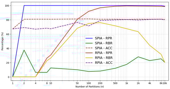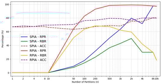 Second, under random poisoning attacks, both the SPIA and the RPIA effectively removed poisoned data and also enhanced the classification performance of the DL model (see Table 5, Figure 11). Compared to Experiment 1, the removal rates of poisoned data increased in both partition methods. Specifically, the best defense performance of the SPIA was observed at n = 8000, where RPR = 97.6 and RBR = 29.9. In addition, the transfer-learned model achieved an ACC of 80.3%, reflecting a 10.9%p improvement compared to the baseline model without any defense method. In contrast, the best defense performance of the RPIA occurred at n = 4000, achieving RPR = 98.8 and RBR = 41.9, with an ACC of 79.9%. This represents a 12.8%p increase compared to the baseline model without any defense method. The RPIA method could remove more than 97% of the poisoned data under random poisoning attacks when n ranges from 500 to 8000 (see the green cells in Table 5).