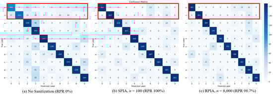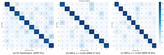 We now report confusion matrices after testing the best-performing models using no defense method (no sanitization), the SPIA, and the RPIA under concentrated poisoning attacks and random poisoning attacks as shown in Figure 12 and Figure 13, respectively.