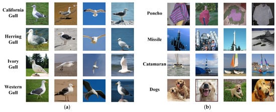 Applying few-shot learning to fine-grained image classification effectively overcomes the challenge of limited labelled data and achieves positive results [12]. However, the challenge in fine-grained image classification extends beyond the issue of limited labelled data. The difference between fine-grained image classification and general image classification can be seen in Figure 1. General images from different classes exhibit significant differences, so the background has a minimal impact on the classification. However, the significant intra-class differences and subtle inter-class similarities between subcategories severely impact the classification. As shown in Figure 1a, horizontally, images in the first row belong to California gulls. However, due to variations in their backgrounds and postures, they look quite different. In contrast, images in the same column belong to different gulls but share some similarities in background and posture, with slight differences in their wings and beaks. This challenge, unique to fine-grained images, amplifies the difficulties of few-shot classification. Therefore, accurately distinguishing these subtle but critical features has played a significant role in few-shot fine-grained image classification.