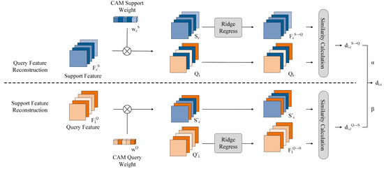 The reconstruction process is shown in Figure 4, including two branches: the query feature reconstruction branch and the support feature reconstruction branch. QFR is designed to ensure the inter-class differences, while SFR is designed to minimize the inter-class similarity. Before the reconstruction, we enhanced the support feature and query feature using the support channel-wise weights :
