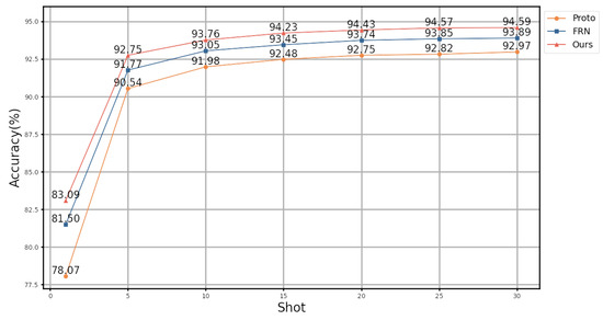 Figure 5 illustrates how the accuracy of the three models varies with different shot numbers for a five-way classification task. Our model outperformed the others for any number of shots. As the number of shots increases, the performance improves gradually. As the number of shots increases, the accuracy of our model increases by , while that of FRN and ProtoNet increases by and , respectively. Compared to the other models, our model is less sensitive to samples per class than other models.