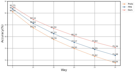 Figure 6 illustrates how the accuracy of three models varies with different numbers of ways for a five-shot classification task. Our model outperformed the others for any number of ways. As the number of ways increases, the performance decreases gradually. With various numbers of ways from 5 to 30, our model’s accuracy decreases from to , while that of FRN decreases from to , and that of ProtoNet decreases from to . This indicates the robustness of our method against the change in the number of classes.