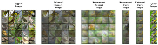The recovery images are shown in Figure 7. The block on the far left displays the original support images in a five-way five-shot classification task, while the rightmost block displays the original query image. The query image is repeated five times for easier comparison of the reconstructed and enhanced images across different categories. The second left block is the support features enhanced by the channel attention weights from query images . The third left block is the reconstructed support features . The second right block is the query features enhanced by the channel attention weights from support images . The third left block is the reconstructed query features .