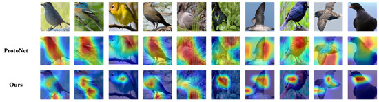 We visualized discriminative regions of ProtoNet and our method using GradCAM [39], as shown in Figure 8. These visualized data are captured from the ResNet12 5-shot model based on the CUB dataset. After learning from support images, we evaluated the model’s performance based on the shown query images. According to the visualization, we found that ProtoNet tends to focus on the whole object, while our model localizes the most delicate discriminative regions.
