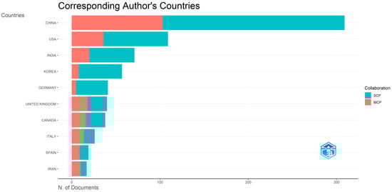 - The collaboration among authors is observed based on the number of SCPs and MCPs. The most important country in terms of publications is China, with 309 papers published (206 SCPs and 103 MCPs), with a total contribution of 33.2%. The USA authors published 109 articles (73 SCPs and 36 MCPs), with a total contribution of 11.7%. India has 71 articles (51 SCPs and 20 MCPs), with a contribution of 7.6.%. The rest of the countries have a smaller impact but are still important and are as follows: South Korea (49 SCPs, 8 MCPs), Germany (36 SCPs, 5 MCPs), UK (22 SCPs, 18 MCPs), Canada (22 SCPs, 16 MCPs), Italy (12 SCPs and 14 MCPs), Spain (10 SCPs, 9 MCPs), and Iran (7 SCPs, 9 MCPs).