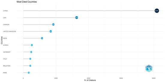 - Taking into consideration the number of citations, China is the most influential country, with 8187 citations. In second place is the USA with 3268, third is Canada with 1839 citations, while the UK is fourth with 1680 citations. In fifth place is India with 1149 citations, Korea with 521 citations, and Germany with 483 citations, while the last three countries are Italy with 424 citations, Malaysia with 424 citations, and Iran with 330 citations.