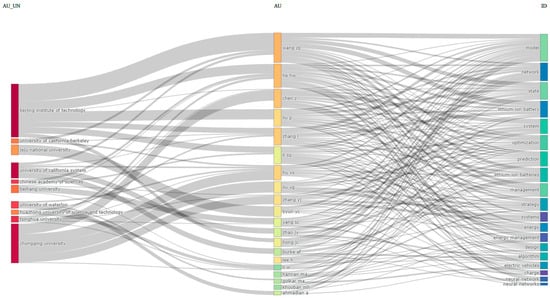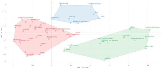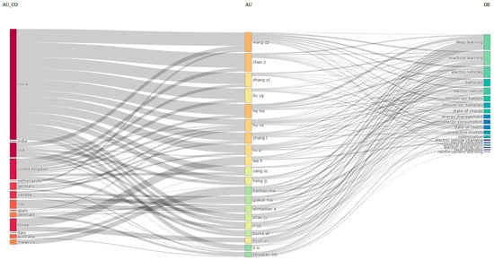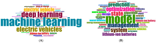 - Analyzing the authors’ keywords, the most important terms are “machine learning”, “deep learning”, and “electric vehicles”, while for Keywords Plus, the most common terms are “model”, “state”, and “management”. Investigating the abstracts, the most used keywords are “electric vehicles”, “machine learning”, and “energy storage”, and for titles, they are “electric vehicles”, “machine learning”, and “lithium-ion batteries”.