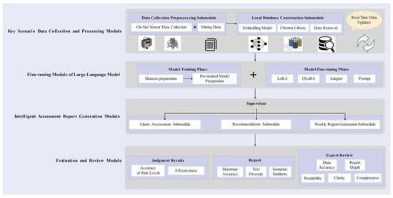 The research framework presented in Figure 1 integrates cutting-edge technologies and is divided into four main modules: the key scenario data collection and processing module, the fine-tuning module of LLMs, the intelligent assessment report generation module, and the evaluation and review module. It constructs an optimized workflow to enhance the efficiency of coal mine safety management and intelligent assessment capabilities. The framework consists of two parallel processes that jointly support the intelligent analysis of gas concentrations and risks. In the data collection and processing phase, the system monitors the concentrations of gases such as methane and carbon monoxide in real-time through sensors deployed at key locations in the mine, ensuring that the data in the database is up to date and provides a reliable data source for accurate assessments. Meanwhile, the fine-tuning of the LLMs proceeds concurrently, starting with the preparation of a pre-trained model as a foundation and creating a dataset for coal mine gas risk assessment. By cleaning and de-sensitizing the collected sensor data, a high-quality risk assessment dataset is built, which is then used to fine-tune the model, specifically optimizing its performance in coal mine risk assessment scenarios. Additionally, the system uses a vector database for efficient data storage and retrieval, and combining it with a local domain knowledge base that supports assessment, the system can dynamically retrieve historical data and safety standards through RAG technology, providing rich background support for real-time assessment tasks.