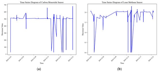 Time series diagram of sensor monitoring data. (a) Time series data collected by the carbon monoxide sensor over a period of time; (b) Time series data collected by the laser methane sensor over a period of time.