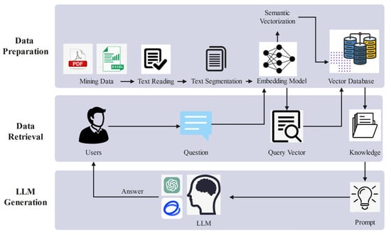 In addition, the system incorporates RAG technology, enabling real-time dynamic retrieval of relevant information from the knowledge base. When sensors detect data, the system utilizes RAG technology to retrieve coal mine safety regulations and judgment standards related to the current situation from the knowledge base. Based on this information, the system generates intelligent judgment reports and provides emergency response recommendations. This mechanism ensures that the system can make decisions in real time using the most up-to-date knowledge base data, while ensuring that its responses are always in line with current safety regulations and industry standards. In this way, safety regulations, industry standards, and sensor monitoring data in the coal mining domain are effectively integrated into the knowledge base, providing comprehensive data support for the system and enhancing its intelligent decision-making capabilities in complex environments. Figure 4 illustrates the specific flow of knowledge retrieval.