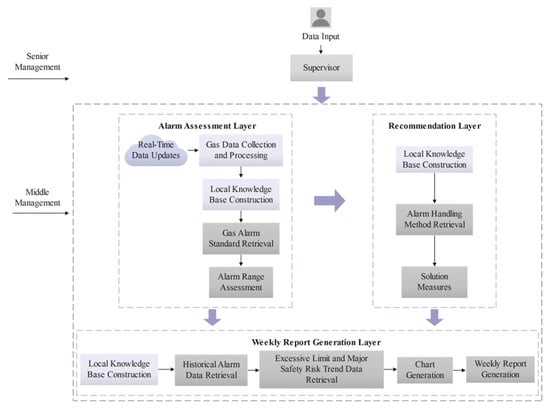 The intelligent judgment report generation is achieved through the multi-agent structure of the fine-tuned LLMs, ensuring an efficient and automated report generation process. This module consists of three main levels: the alarm judgment layer, the action suggestion layer, and the weekly report generation layer. Each level is composed of several key agents, which work together to execute different tasks, ensuring the efficiency and accuracy of the judgment and report generation process. The alarm judgment layer is responsible for the preliminary analysis of gas alarm data and determining if it meets the alarm standards; the action suggestion layer proposes corresponding emergency response measures based on the alarm information; the weekly report generation layer generates the final judgment report based on the results from the previous two layers, summarizing and synthesizing the findings. Figure 5 shows the main roadmap of the intelligent judgment report generation module, clearly illustrating the workflow between the different levels and agents. Throughout the report generation process, each level relies not only on data analysis and model inference but also integrates expert feedback and real-time updated information, ensuring that the judgment results and report content are highly accurate and practically actionable.