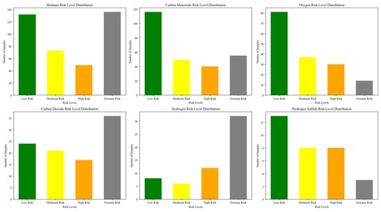 In coal mine gas risk assessment, gas concentration is closely related to mine safety. To achieve more accurate risk judgment, the experiment used validation set samples, focusing on evaluating the framework’s response to changes in the concentrations of different gases, particularly its ability to distinguish between high-risk gases and environmental gases. According to the risk assessment results, Figure 6 illustrates the distribution of risks within the validation set samples as determined by the proposed IGRARG framework. The results indicate that the model can accurately classify samples into corresponding risk levels for all types of gases, particularly excelling in the risk assessment accuracy for high-risk gases such as methane and carbon monoxide. Conversely, samples of low-risk gases such as hydrogen and carbon dioxide are predominantly classified within the low risk level. These findings align with expectations regarding gas concentrations and risk assessments in coal mines, further validating the effectiveness of the framework in coal mine gas risk assessment.