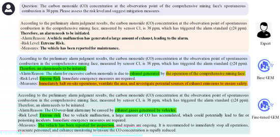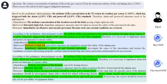 To conduct an in-depth analysis of the reports, we selected typical coal mine alarm judgments, focusing on three aspects: the different sensor installation positions, the maximum concentration values, and the processing results. We then compared the expert-generated judgment reports for these alarm events with those generated by the fine-tuned GLM and the non-fine-tuned GLM. As shown in Figure 7 and Figure 8, when generating automated judgment reports using the fine-tuned GLM and the non-fine-tuned GLM, we highlighted the key information in the detection data using bold font.