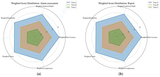 Distribution of expert evaluation results. (a) Multidimensional evaluation distribution of the alarm assessment results by experts; (b) Multidimensional evaluation distribution of the assessment report by experts.