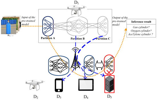 Compared with conventional methods of computation offloading for pre-trained neural networks, our scheme is tailored to harsh scenarios where devices may fail. We leverage redundancy to counterbalance the impact of device failures. More specifically, if some devices fail in harsh operation conditions, our scheme can adapt collaborative computing across multiple devices with redundant partitions of neural networks and perform inference efficiently. It is essential to note that for this design, partition copies are not offloaded randomly. Upon a device failure being detected, the partitions offloaded on this device cannot support model inference, and the redundant copy of these partitions will be used instead. Here, we need to maintain necessary redundant copy of the partitions; otherwise, we must initiate the process of offloading a new copy of the same partitions to other devices and delay the inference process. Note that, the unnecessary redundancy for specific partitions will occupy the limited resources on devices and degrade inference efficiency. Therefore, we offload the copy of partitions in an adaptive way, achieving efficient and failure-resilient inference. Specifically, for model partitions with copies, we treat each original partition and its copies as a unit. After a device fails, the partition copies on this device, as well as their connected partition copies, cannot be used any more. In this case, we need to calculate the number of copies for each partition and adapt the offloading of the partition copies with Formulas (6)–(8). For the example illustrated in Figure 4, after device D4 fails, not only do the partition copies on D4 become unavailable, but also some successors or precursors of these partition copies become unavailable according to the logic described in lines 10–23 of Algorithm 1. In this algorithm, when a device fails, it triggers a series of checks regarding the connectivity and the availability of related partition copies. For instance, when D4 fails, the system checks if there are any successor or precursor relationships between the partition copies on D4 and those on other devices. Due to the absence of an alternative execution path as defined in the algorithm, some related partition copies on other devices become unavailable. Specifically, in this case, the copy of partition B on D5 is also unavailable after D4 fails. This is because, based on the algorithm, D5 might be considered as a successor or precursor in a certain relation to the partition copies on D4, and when D4 fails, the lack of a proper execution path makes the copy of partition B on D5 unable to be used for inference any more.