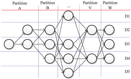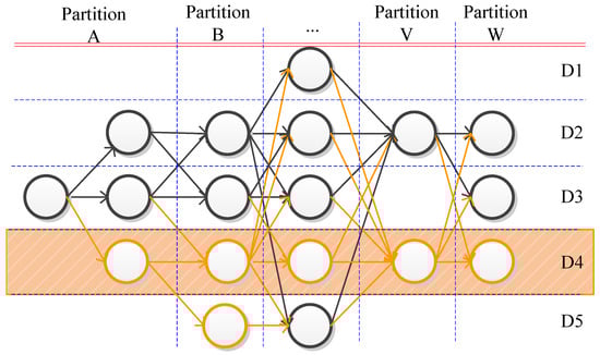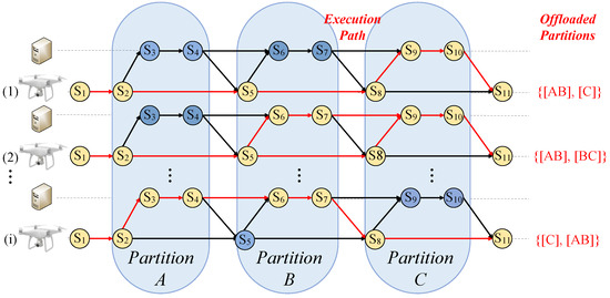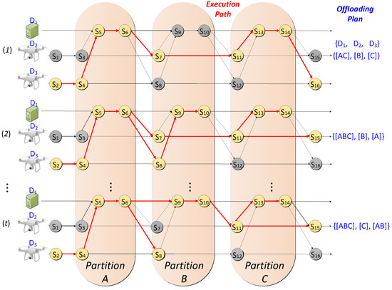 The execution delay of the partition copies changes by time. As depicted by the execution graph in Figure 5, each edge between two different states is associated with a specific delay. After a copy of the model partition is offloaded to an edge device, we can take this device to execute the offloaded partition copy without any transmission delay, and the delay for the copy of partition i is equal to the local execution delay . Otherwise, a copy of this partition will be offloaded to another high-performance device, and the total delay, , includes the transmission time of input, ; the transmission time of output, ; and the execution delay, on the new device. Hence, the inference delay with the partition is