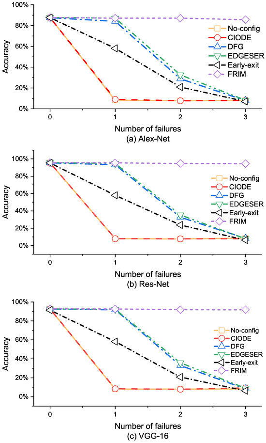 As depicted in Figure 6, for all of the three pre-trained models, FRIM maintains high accuracy. When a random failure occurs, the accuracy of No-config and CIODE decreases to about 7–9% due to their design without failure-resilience configuration. In contrast, DFG, early exit, EDGESER, and FRIM are implemented with failure resilience design. When the number of failures increases, the inference accuracy of DFG, early exit, and EDGESER drops sharply, whereas FRIM can maintain accurate inference very well. This is because DFG has a limited number of skip hyper-connections, where skip hyper-connections are only added between every two neural network layers. Once successive neural network layers fail, the intermediate data of DFG will be lost. The accuracy of early exit and EDGESER will drop more than 57%. In contrast, FRIM offloads the copies of the pre-trained models to the candidate nodes before detecting a failure. Taking advantage of optional execution paths, the intermediate data of FRIM will not be lost, thereby ensuring the accuracy of inference.