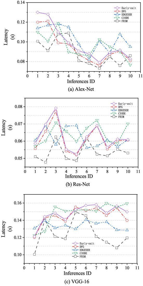 To demonstrate the enhanced inference efficiency of FRIM, we compare the inference efficiency of FRIM with that of CIODE, DFG, DGESER, and early exit. Similar to the experiential implementation for impact evaluation of different failures on inference performance, we deploy the partitions of the pre-trained model and schedule the failure of the devices in a random way. Figure 7 illustrates the latency of ten inferences for FRIM and the other baselines for the considered benchmarks (Alexnet, Res-Net32 and VGG16). Each point represents the latency of an inference task. Due to adverse conditions like network jitter, the inference latency of FRIM, CIODE, DFG, EDGESER, and Early-exit exhibits a fluctuating trend of initially increasing and then decreasing over their average latency. FRIM achieve the shortest latency comapred with the others, since the other schemes cannot complete inference tasks without any interruption except for FRIM. The inference latency of EDGESER is longer than that of DFG and early exit due to EDGESER taking too much time to support more redundant failure resilience. Benefiting from neural network partitions and their copies offloaded to candidate nodes, the inference tasks are performed continuously without any interference. On the other hand, the total latency for Alexnet is higher but still lower than VGG16, which happens as Alexnet has two independent paths that come to be efficiently parallelized by all schemes. ResNet32 achieves the best evaluation results in terms of inference efficiency due to its enhanced residual computation.