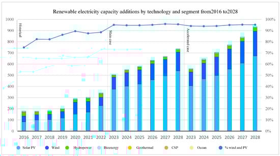 The extensive use of fossil fuels such as oil, coal, and natural gas have caused a serious greenhouse effect and environmental pollution, which has a significant impact on the environment [1]. At the same time, there is also a big contradiction between the supply capacity of fossil fuels and the total global energy demand. With the global energy shortage, the general trend is to vigorously develop renewable energy. Among the many clean energy sources [2], the development and utilization of solar energy accounts for the highest proportion, and solar energy also has the most potential for development. Photovoltaic power generation is one of the important components of the world’s energy in the past few decades, because of its easy installation, low operating costs, mature technology, and other characteristics. It has become one of the most practical renewable energy technologies. The global growth of photovoltaic power generation systems (PSG) [3] is very rapid and varies greatly between countries. The International Energy Agency (IEA) estimates that the new installed capacity of renewable energy will reach 507 GW in 2023, nearly 50% higher than in 2022. Due to China’s strong development of solar and wind energy, in the next five years, the capacity of newly installed renewable energy will continue to increase; solar and wind accounted for 96% of the record. Figure 1 shows the new renewable electricity capacity, by technology, from 2016 to 2028.