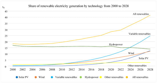 By 2028, the global electricity mix will be transformed, with 3700 GW of the new renewable energy capacity connected to the grid between 2023 and 2028. Renewables account for more than 42% of global electricity generation, with wind and solar set to account for 25%. Figure 2 shows the share of renewable energy by technology for 2000–2028.