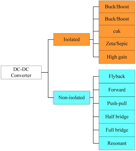 According to published industry research results, bidirectional DC-DC converters are classified into non-isolated and isolated types according to whether they have an isolation function. Non-isolated bidirectional DC-DC converters include bidirectional buck/boost, bidirectional buck–boost, bidirectional Cuk, bidirectional Zeta/Sepic and high-increase DC converters, while isolated types include bidirectional flyback, bidirectional forward, bidirectional push pull, bidirectional half bridge, bidirectional full bridge and DAB converter. According to the input circuit type, there is the voltage source type and the current source type; if according to the basic unit expansion, there are series type, parallel type, combined type and compound bidirectional DC-DC converters, and according to the input port classification, there are two ports and multi-ports. In terms of technology, there are soft switches and reactive switches. The classification of DC-DC converters is shown in Figure 4. In this paper, the converter will be described from two categories: the isolated type and non-isolated type.