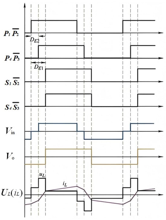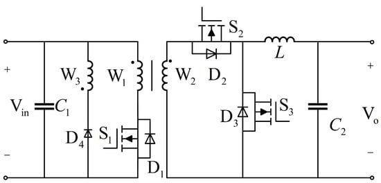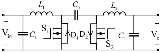 The zero-voltage switching (ZVS) condition can be achieved by the switch’s parallel diode conduction. The parallel diode will conduct just before the switch’s turn-on moment so that the switch’s voltage will be fixed at zero and the switch will turn on with soft switching condition [14]. In order to achieve the soft switching conditions of traditional buck converters, reference [15] added LC auxiliary circuits to the switches. When the switch is turned off, the current of the capacitor is discharged through the resonant capacitor, causing the voltage across the switch to gradually decrease to zero, achieving ZVS, and the output current ripple is almost zero. The converter proposed in reference [16] uses coupled inductors and diodes to greatly improve voltage gain. By using coupled inductors and clamping circuits, the voltage stress on the main switch and diode is effectively reduced, thus allowing the use of devices with lower voltage levels and reducing on–off losses. However, during the switching process, due to the influence of parasitic capacitance and leakage induction, additional voltage stress may be generated.