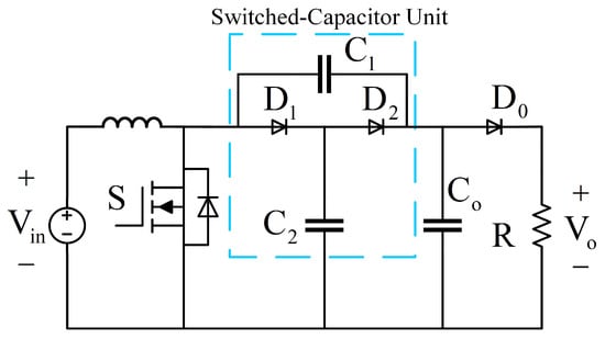 The switching capacitor [29] unit is a topological unit that realizes high voltage boost based on the optimization and improvement in the charge pump technology. By utilizing the characteristics of capacitor energy storage and voltage non-sudden change, multiple capacitors are charged and stored in parallel during the energy conversion process of the converter, and the output voltage of a higher voltage level is obtained by series discharge. The most basic high-gain DC-DC converter topology with a switched capacitor unit is shown in Figure 9, where capacitors and and diodes and form a basic switched capacitor unit. When the switch tube S is on, the input voltage source charges and stores energy to the inductor L, and the capacitor charges and stores energy to the capacitor through the diode . When the switch tube S is disconnected, the inductor L and capacitor release energy to the output load R and the capacitor and through diodes and , thereby increasing the output voltage level of the converter and increasing the voltage gain of the converter [30].