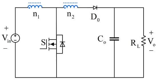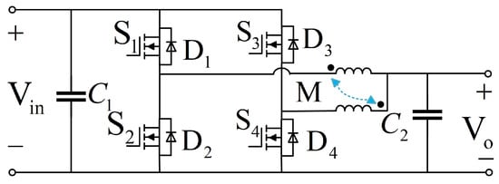 Magnetic coupling is one of the most popular voltage converter technologies recently, and the principle of transformer is the same, the coupling inductance is equivalent to a non-isolated transformer; in theory it can be regarded as a transformer with a certain coupling coefficient. By changing the turn ratio of the coupling inductance reasonably, the high voltage output of the converter is realized on the premise of avoiding the limit duty cycle. Figure 12 shows the basic topology of coupled inductance type high-gain DC converter [38]. When the switch tube S is on, the secondary winding voltage of the coupling inductor = −N; when the switch S is off, the secondary winding voltage is = −ND/(1 − D), where N is the ratio of turns of the primary and secondary winding of the coupling inductor. Ignoring its leakage inductance effect, the voltage gain of a high-gain DC converter with coupled inductance can be expressed as M = .