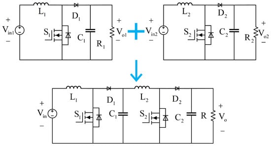 In the existing high gain implementation technology, the cascade converter boost technology is the simplest and most direct, the principle is to cascade two or more single-phase DC converters in turn (that is, the output of the upper level converter is the input of the next level converter), and finally get the total output voltage gain is the product of the voltage gain of all levels of the converter, that is, M = × × …× , so as to achieve the purpose of improving the voltage boost capacity of the converter. Figure 13 shows the basic cascaded high-gain DC converter [43] built by cascading two traditional boost converters.