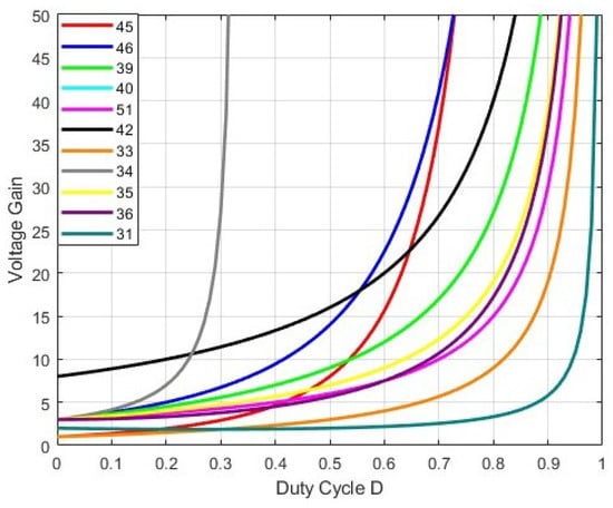 In reference [48], two coupled inductors and clamping circuits are added to the interlaced boost converter to achieve the ZVS condition when the switch is on and the ZCS condition when the diode is off, so as to generate the linear current of the switch and the diode. However, the converter relies on coupling inductance to realize soft switching, which limits the application of soft switching technology in high-voltage gain DC-DC converter. Reference [49] describes a high-gain compact interlacing boost converter that reduces the number and size of components by using coupled inductors and shared clamp capacitors. The leakage energy of the coupling inductor is effectively utilized, which further improves the converter efficiency and reduces the loss. However, under light load conditions, the efficiency will decrease due to the on–off and on–off losses that still exist. Especially when the input voltage is low, the leakage energy utilization is insufficient, which may affect the efficiency. The converter mentioned in reference [50] achieves very high voltage gain by coupling inductors and voltage multiplication units. The topology uses a staggered structure, and the input current ripple is significantly reduced. The reverse recovery problem of the diode is alleviated, and the lost energy is recovered. At the same time, coupled inductors and voltage multiplication units are used to achieve staggered energy storage at the output end, which reduces the voltage stress on the diode and switch tube. The converter does not need an extreme duty cycle or high turn ratio to obtain a higher boost voltage gain, and the turn ratio can be increased to obtain further voltage gain. Table 2 below compares the high gain converter efficiency, voltage gain and duty cycle, and cost, and produces an image of the voltage gain increasing with the duty cycle as shown in Figure 15.