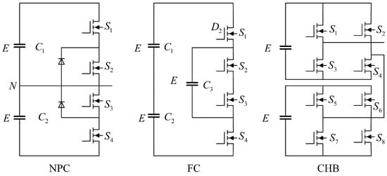 The multilevel converter can control the series output of different DC power supplies through the specific topological transformation of multiple DC power supplies and power electronic devices. Under different switching states of the conversion circuit, the multilevel output of different amplitudes can be obtained at the output end. Because there is no inductance, the weight and size of the converter are significantly lower than those using magnetic components, so the converter is compact and low cost. Common multilevel topologies are divided into three types: diode clamped (NPC), flying capacitor (FC), and H-bridge cascade. Each of these three structures has its own characteristics, but there are also corresponding shortcomings. Their topology is shown in Figure 16. For example, compared with other multilevel converters, the H-bridge cascade topology has advantages such as low voltage stress, multiple redundant switching states, flexible control mode, easy encapsulation, and easy expansion of level number. However, the disadvantage is that multiple independent power supplies or multi-winding phase-shifting transformers are required, which is large and costly.