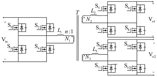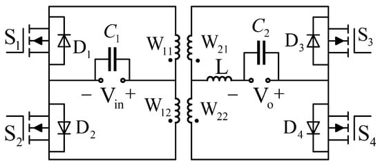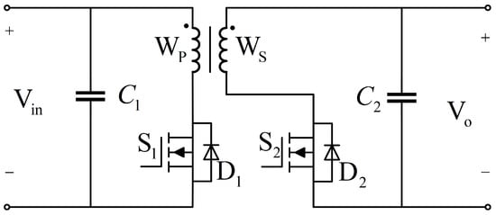 The bidirectional forward converter [62] is composed of parallel diodes at both ends of the primary side power tube and parallel power tubes at both ends of the secondary side of the unidirectional forward converter. The topology is shown in Figure 18, which can work in forward transmission, reverse transmission and alternating transmission modes. In this topology, , and all work in PWM control mode. and are switched on and off at the same time, and work in a complementary manner with . The bidirectional forward converter has a simple working principle, easy design of its control and drive circuit, which is suitable for small and medium power occasions, but the transformer used is in a unidirectional excitation state, and the utilization rate is low.