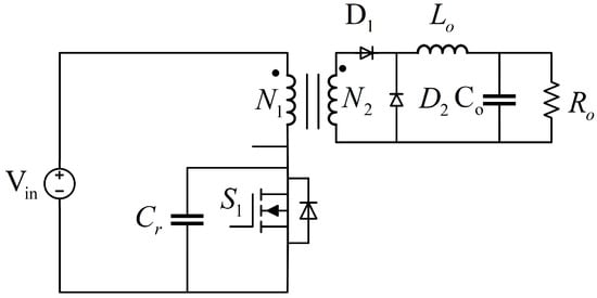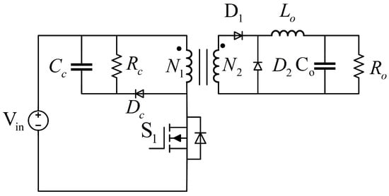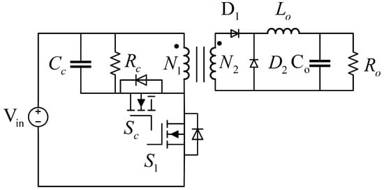 The structure of the RCD forward converter is shown in the Figure 19. Because the clamping capacitor is large, it can be regarded as a voltage regulator in stable operation. When the switching tube is turned off, the diode is switched on, and the voltage on the makes the transformer magnetic reset. It has the advantages of simple circuit structure and low cost. However, the excitation energy and leakage energy of the transformer are completely consumed in the reset resistance, and the conversion efficiency is low, which is suitable for applications with low efficiency requirements and low price [64].