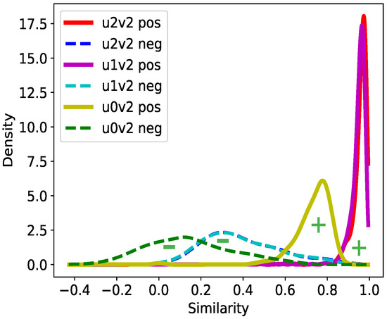 Similarity distributions of cross-layer embeddings between two augmented views (for GRACE). u and v denote two augmented views derived from the original graph. The vertical axis represents the node similarity calculated using the dot product. The vertical axis represents the probability density function values estimated using a Gaussian kernel. All positive pairs are substantially more similar than negative pairs, labeled as with m and n numbering the layers.