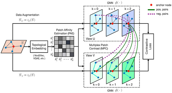 From the rationale above, we establish “effective patches” using all representations of the encoder for contrastive learning. Each nodal embedding ( in the other view) on the k-th layer of the GCN now serves as an effective representation of a k-hop ego-net centered at the anchor node. Specifically, the definition of the patch representation takes the standard form with the initial input , where is the normalized adjacency matrix, and a set of trainable parameters.
