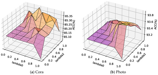 Hyper-parameter analysis (Acc (%) for 3 seeds) on Cora and Photo. The combinations of that cannot be taken among them are set to the average.