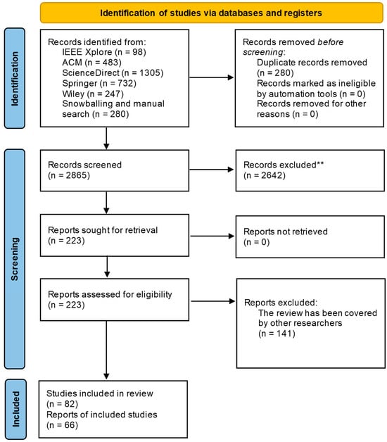 PRISMA flow diagram. ** Records excluded after title and abstract screening due to duplication, irrelevance to IoT architecture or security, non-English language, or non-peer-reviewed sources.
