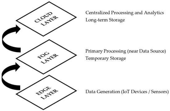 Cloud computing architecture and fog computing architecture are essentially the same. Processing occurs on discrete devices at the network’s edge to differentiate this system from others []. Fog computing is also known as computing at the periphery or edge. As previously stated, this system is more scalable than cloud-based designs [,,,,].