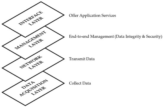 Similarly, the data collection layer is like the perception layer in terms of its function. It tries to identify the data and transfers it to the network layer by using an IP address. It is also responsible for data processing (via data processing techniques). The network layer handles communication protocols. It might be a wired or wireless network. Protocols such as Z-wave, Zigbee, etc., are often used [,,,,,]. The management layer is responsible for ensuring the integrity of the whole system. It checks whether the data was correctly sent to the other end. Additionally, it helps to ensure the integrity and security of the information that is being stored. It ensures that the information is sent to the appropriate person. Alternatively, the phrase “Business layer” is used to describe this layer of code. It is often referred to as the application layer. Additionally, it handles data formatting and display. It provides users and other applications with information about interaction strategies.