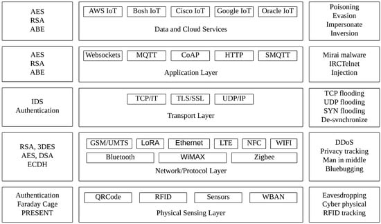 - Mrabet, H.; Belguith, S.; Alhomoud, A.; Jemai, A. A survey of IoT security based on a layered architecture of sensing and data analysis. Sensors 2020, 20, 3625. [Google Scholar] [CrossRef]